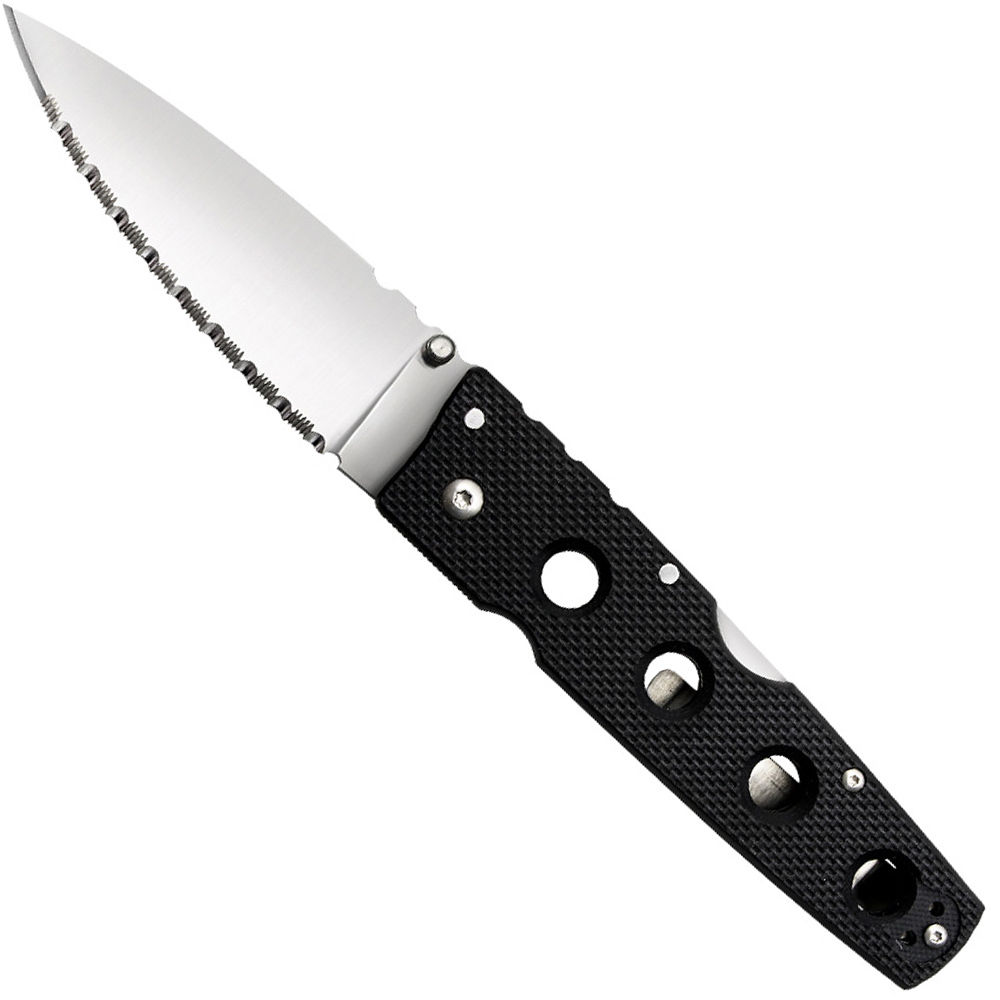 The Cold Steel Hold Out Large Serrated Edge sports a very ergonomic design. It can also be carried everywhere easily with you during adventure trip or camping. The handle has a nicely fitted clip that can be attached with the belt. Knives from Cold Steel are quite popular as they deliver high performance. The blades have serrated edges and reflect the beauty of satin polish. American G-10 handle permits a four-fingered stout grip. The knives are capable of tearing and slashing the toughest of substances with their immense strength. But the knives are lightweight and therefore easy to use.