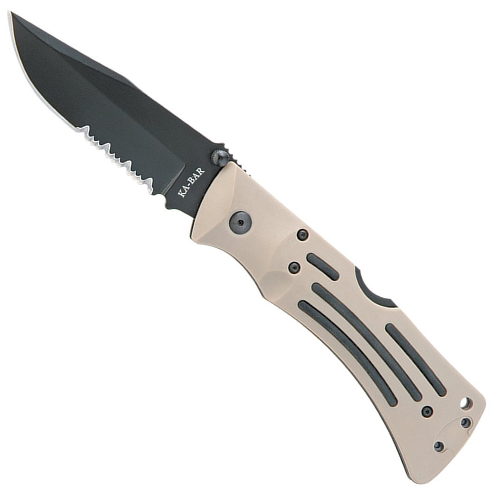 This heavy-duty piece of equipment is the folding knife's answer to the traditional KA-BAR fixed blade. The answer to your requests for a heavy duty folding knife, the sturdy construction and pure heft of this folder allow it to hold up under even the most severe conditions, and withstand any test you dare put it through. Heavy-duty lockback folder is big, feels solid in the hand, and is tough enough to tackle the most demanding chores. Features a reversible pocket clip. Sold with a polyester sheath.
