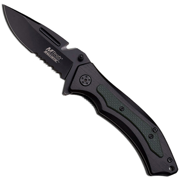 This sprint assisted knife has an over all closed length of 4.75” and a blade length of 3.5”, the bottom 1.25” of which is serrated. This knife has a sleek matte black finish with dark green detailing. It comes with a pocket clip and rescue cutter on blade.