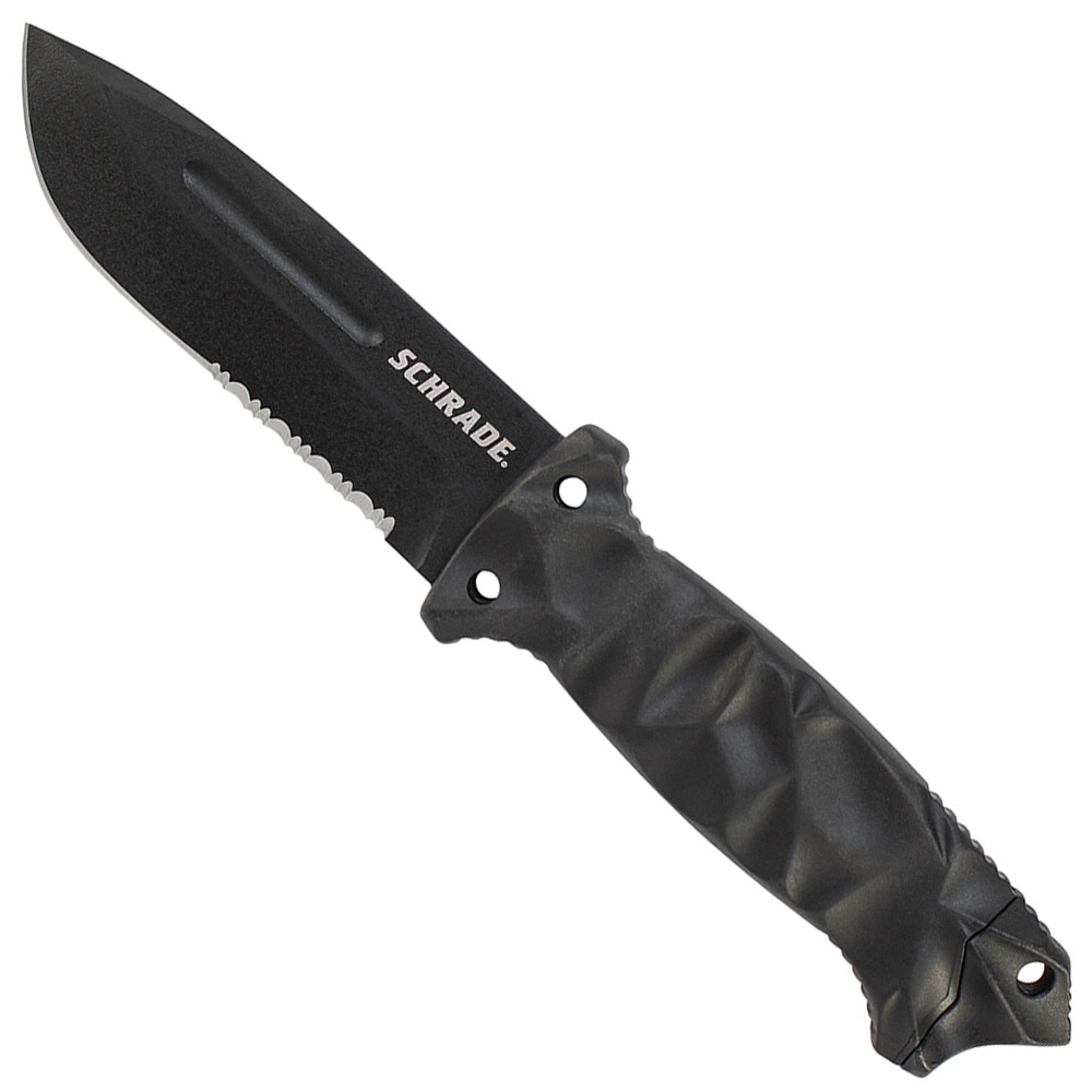 The schrade full tang is a fixed blade knife. The blade is 420J2 stainless steel and is powder coated drop point blade and blood groove, The handle is made from glass-filled nylon TPE overmold with a stainless steel pommel and lanyard holes.The sheath is a removable M.O.L.L.E. compatible nylon belt sheath made of molded glass-filled nylon with TPE overmold with a built in sharpening stone and multiple lashing options for Gear Thermoplastic sheath with multiple lashing options.