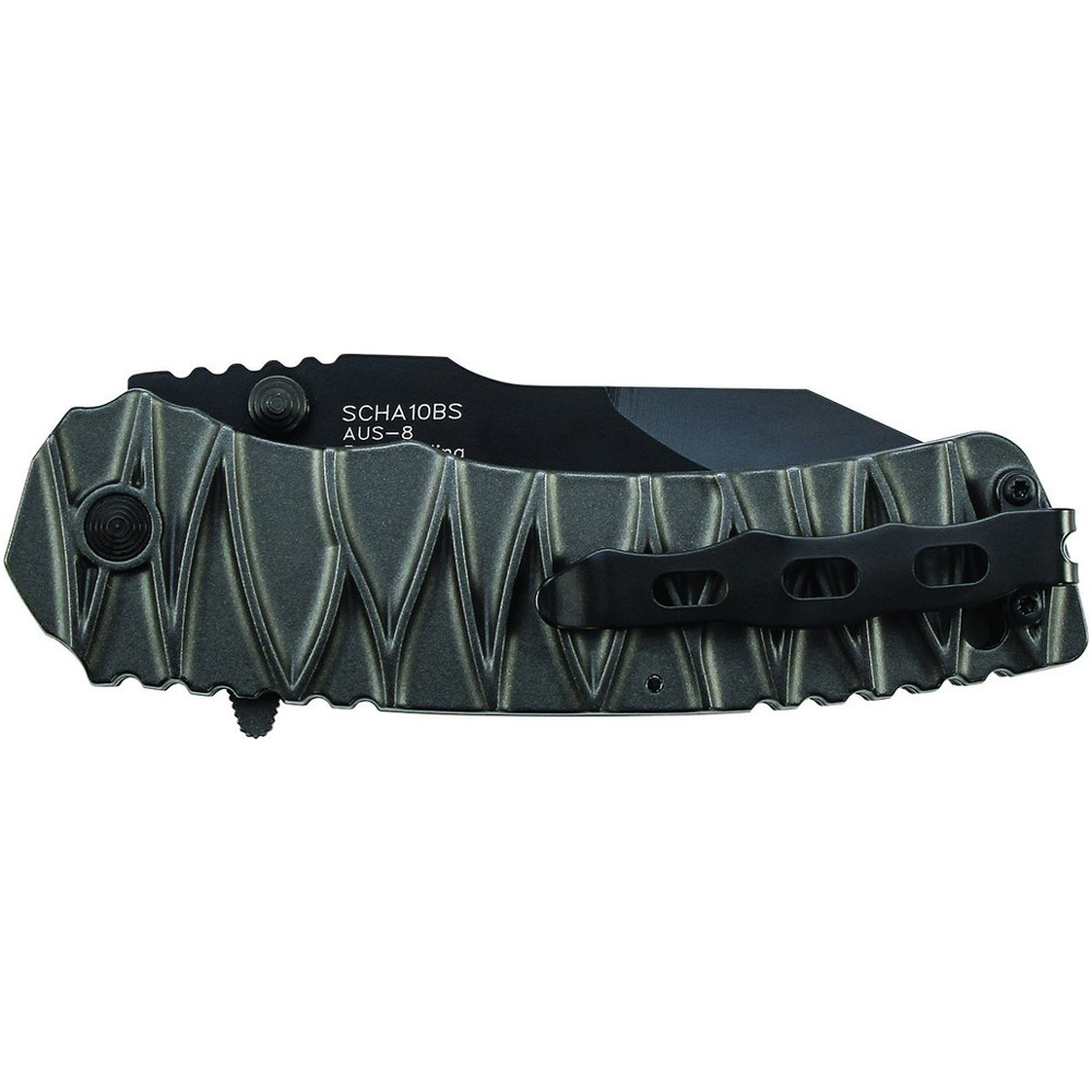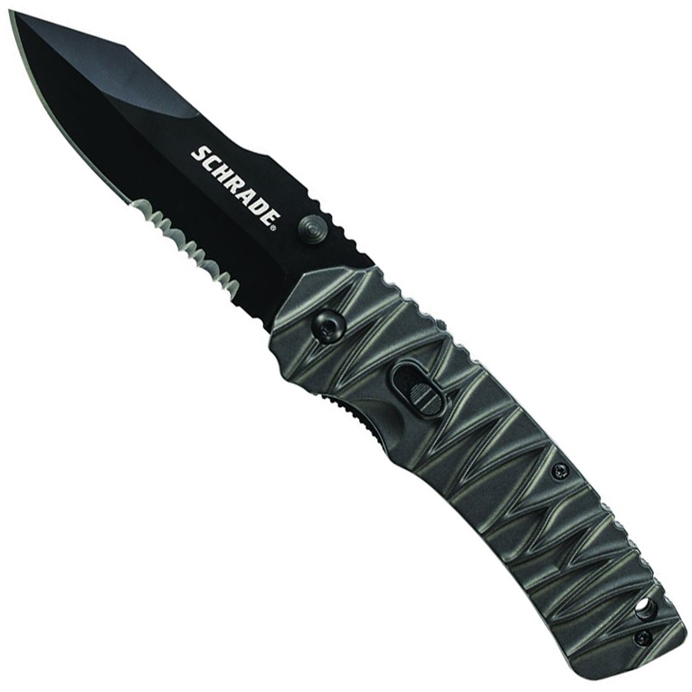 Schrade M.A.G.I.C. Dual Action Manual & Assisted Opening Liner Lock Folding Knife, Black AUS-8 High Carbon Stainless Steel Partially Serrated Clip Point Blade with Ambidextrous Thumb Knobs and Thumb Rest Jimping, Grey Ridged Aluminum Handle with Model Selector Switch, Spine Jimping, Lanyard Hole, and Pocket Clip. Features Blade Length: 3.47 inch (8.81 cm) Handle Length: 4.65 inch (11.81 cm) Overall Length: 8.09 inch (20.55 cm) Weight: 0.37 lb